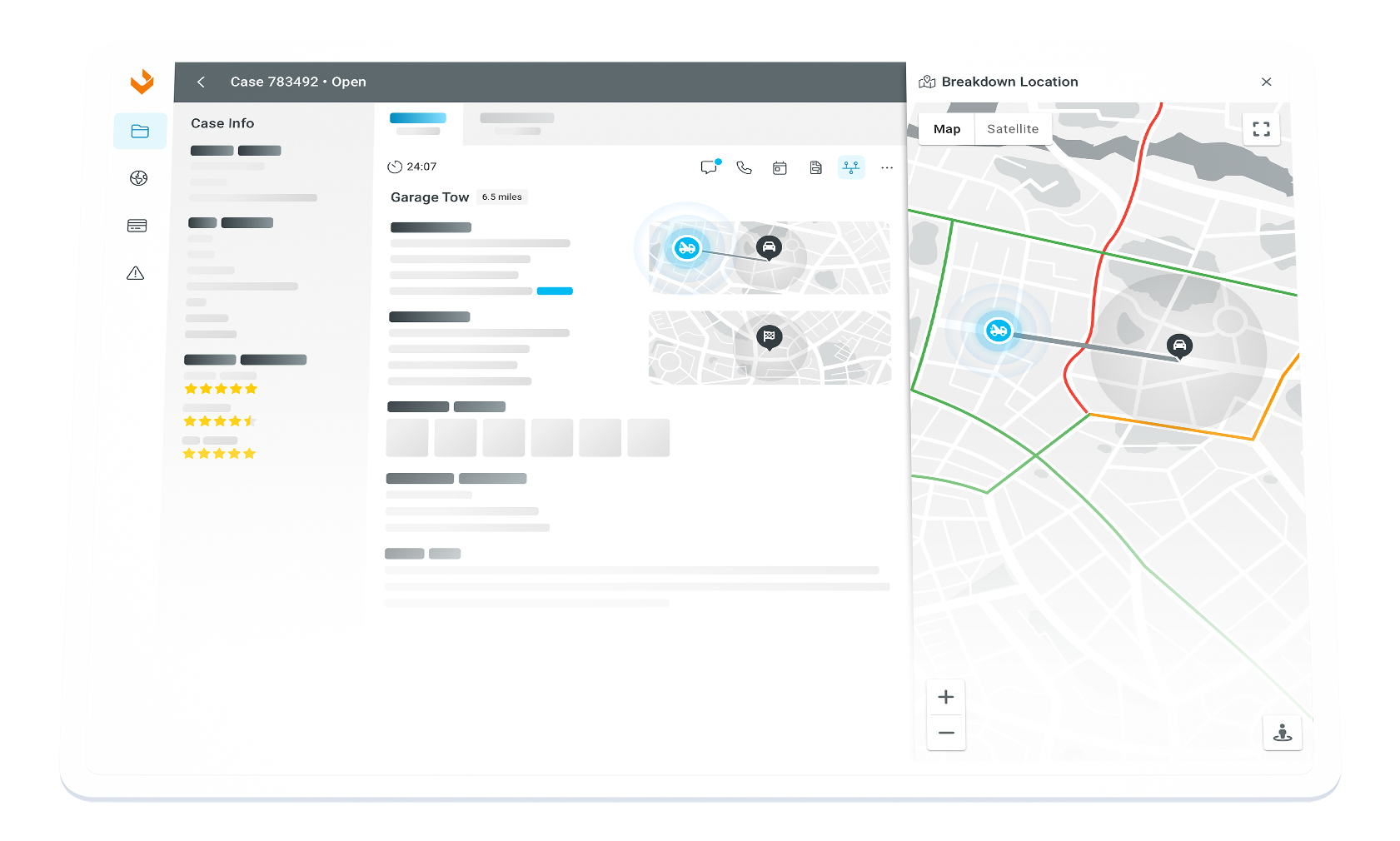 In-depth case information with vehicle details, location mapping, and service activity timeline.